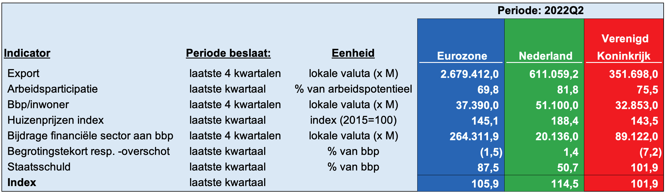 Bovenstaand overzicht laat de relatieve waarden zien, met het vierde kwartaal 2019 als ijkpunt (index = 100). In onderstaande tabel zijn de absolute waarden opgenomen voor het tweede kwartaal 2022 waardoor een beter inzicht mogelijk is in de orde van grootte waarin de uitkomsten zich bewegen. Het meest in het oog springende detail hierin is, dat de Nederlandse export zo dominant is ten opzichte van de Britse en dat door de diverse nationale coronasteunpakketten de begrotingstekorten in alle economieën hoger zijn dan normaal en dat de staatsschuld oploopt (hoewel die in Nederland relatief in toom lijkt te worden gehouden en zich nog ruim onder de EMU-norm bevindt).