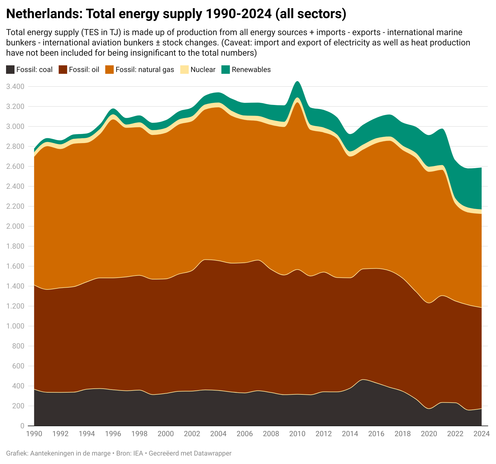 Nederland is voor zijn energiebehoefte nog voor meer dan 82% afhankelijk van fossiele brandstoffen. In 1990 was dat 96%. Na het afsluiten van de Groningse gasbronnen, komt onze behoefte aan fossiele energie nagenoeg geheel uit het buitenland. Het aandeel duurzame energie is in de periode 1990 tot en met 2024 van 1,5% gestegen naar 16,5%. Daarvan is het grootste deel weer afkomstig uit biobrandstoffen die, naar mijn mening, oneigenlijk als duurzaam worden aangemerkt (bij verbranding komt namelijk nog steeds CO2 vrij!). Daarnaast kan worden opgemerkt dat de afbouw van onze aardgaswinning, gelet op de emotionele en fysieke schade van betrokken inwoners in Groningen, een juiste beslissing was; vanuit het oogpunt van de energietransitie heeft het echter nagenoeg niets opgeleverd en de schatkist miljarden gekost.