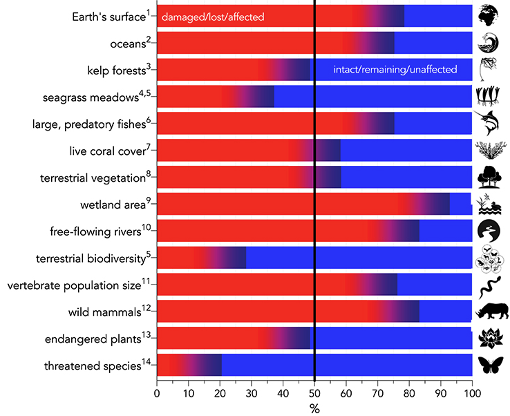Red indicates the percentage in that category that is affected, lost, or otherwise threatened, and blue indicates what is intact, standing, or unthreatened