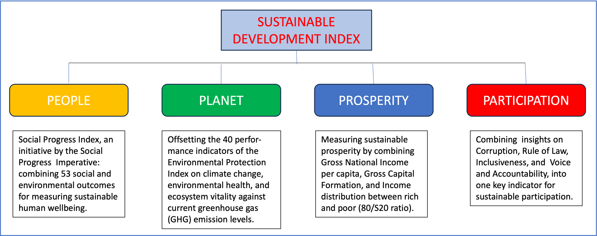 In part, I fall back on existing indexes in compiling my Index. The People pillar is based on the Social Progress Index (SPI) by the Social Progress Imperative, which has been tracking the development of quality of life in 170 countries for over 30 years. For the Planet pillar, I draw heavily on the Environmental Performance Index (EPI), a joint initiative of Yale and Columbia universities. It tracks 180 countries in their efforts to combat climate change and environmental and ecological damage from human activity. Although the EPI follows more than 40 performance targets in great detail, it gives too much weight to the extrapolated greenhouse gas emissions in 2050 (totaling nearly 14%). Extrapolation based on past performance seems too speculative in a politically changing climate. The next edition of the SDI will have to take a critical look at this. All other indicators are borrowed from The World Bank's World Performance Indicators. The latter, in turn, obtains its data from a large number of specialized institutes in specific fields.